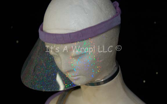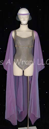 Description: A costume featured in the Star Trek: Voyager episode “Inside Man”; wherein a Ferengi hatches a plan to steal nanoprobes from “Seven of Nine” (Jeri Ryan) when Voyager comes through a geodesic fold back to the Alpha Quadrant. This costume is that which “Deanna Troi” (Marina Sirtis) is wearing when “Reg Barclay” (Dwight Schultz) sneaks up on her at the beach, it is a reflective-silver, one-piece swimsuit, a sheer, orchid-colored robe, and matching visor. The swimsuit features a sewn in Voyager tag that reads ‘Marina Sirtis’.