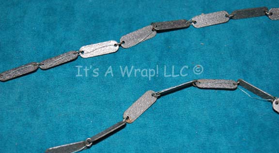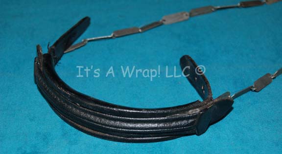 Description: A costume accessory similar to those featured in Star Trek feature films and episodic television - a vinyl Klingon shoulder aglet. The item is made from four strips of black vinyl fashioned to create a padded effect; the top most strip is adhered to the next with two black metal accents affixed to the ends. The item features puncture holes where hanging, metal accent ‘chains’ were attached. The item is meant to be the top of a strap or chain for a holster or knife sheath.