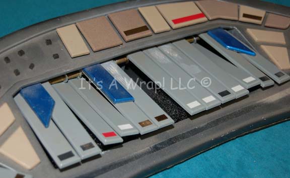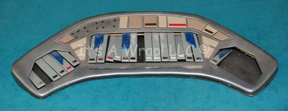 Description: A prop musical instrument keyboard featured in the opening of the Star Trek: Deep Space Nine episode “Equilibrium”. The item was said to be “Jake Sisko’s” (Cirroc Lofton) but was played by “Jadzia Dax” (Terry Farrell) as memories of a long forgotten personality resurfaced within her. The item is an injection molded crescent moon shaped affair with cut away where foam padding has been inserted to allow for plastic ‘keys’ to be positioned. A grouping of buttons rest across the top. The item is elaborate but has seen better days, it is missing several keys. The item measures approx. 23.5 X 9.5 X 2.25 inches.