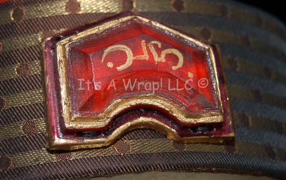 Description: A costume featured of the style featured in various Star Trek feature films. This costume consists of a full-length, rust-colored robe featuring large, bell-sleeves; a full-length, over the shoulder sash featuring a metallic rust and olive colored designed with a gold and brown brick design down the side, reflective gold-colored lining and a large, red “jewel” near the shoulder with Vulcan iconography on it. Included is a matching rust-colored felt hat in the Vulcan style with trim and chinstraps in the same brick design, and a similar “jewel” on the forehead.