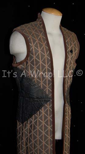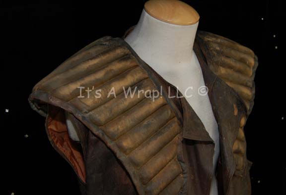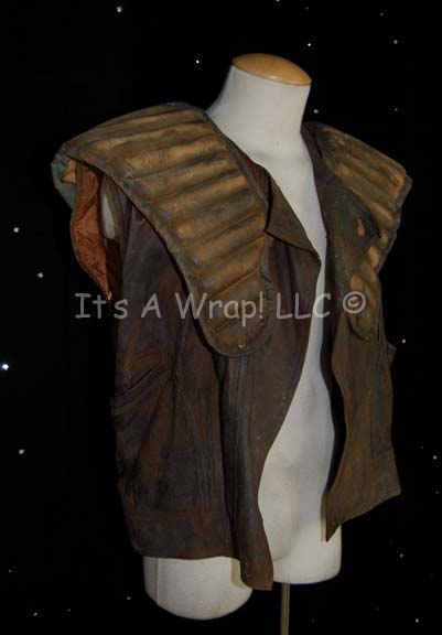 Description: A lot of costume elements featured in various episodes of 24th century Star Trek episodic television involving the Maquis. The first item is a Maquis vest for wear by veteran extra Taryk Ergin as “Lieutenant Ayala”, an actor who was in the majority of episodes of Voyager but only had lines in four episodes, in Voyager episodes like “Caretaker”, “Repression” and “Shattered”; it is a weathered, brown, leather jacket featuring yellowed, large quilted “shoulder pads” added to it and several functional pockets including a hidden one on the inside. Two items for wear by John Franklin-Robbins in the role of the Maquis leader that “Ro Lauren” (Michelle Forbes) begins to sympathize with during her mission to infiltrate his cell in the TNG episode “Preemptive Strike”, “Macias”; two exceedingly-long, identical vests in various shades of brown featuring an almost black pinstripe pattern with a lighter brown diamond motif and vertical stripes, dark-brown faux suede trim, and darker still brown leather accents with a wrinkled look to them. The last item is a jacket for wear by Ken Marshall in the role of the Federation security officer who defected and became the head of the Maquis, “Lieutenant Commander Michael Eddington”, a long-sleeved, brown, leather jacket with reinforced padding along the shoulders and that has been weathered for effect. All items feature sewn in tags that denote wear by the described actor save the second “Macias” jacket whose tag has been replaced with one for an episode of “Enterprise”.