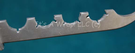 Description: A prop knife like the one appearing the Star Trek: Enterprise episode “Stratagem” for use by “Captain Archer” (Scott Bakula) to cut into the wrist of “Degra” (Randy Oglesby) in removing a Regulan bloodworm. The item is a molded rubber knife with a metal internal framework, the whole item is painted metallic silver, the hand grip is painted to add texture. Measures approx. 11 X 1.25 X 0.5 inches.