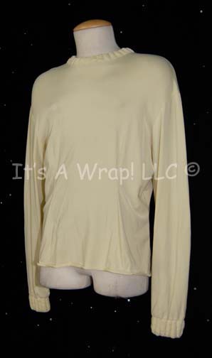 Description: A costume element similar to those featured in various Star Trek feature films from “The Wrath of Kahn” to the opening scenes of “Generations. This item is a long-sleeved, Starfleet uniform undershirt in Command white with a ribbed collar, clasps at the neck and a zip down the back. This garment in particular features a sewn in Paramount tag that reads ‘Bill Shatner’.