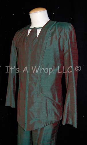 Description: A costume featured in the Star Trek: Deep Space Nine episode “Honor Among Thieves”, wherein “Chief O'Brien” (Colm Meaney) infiltrates the Orion Syndicate to ascertain whom the Syndicate have leaking intelligence in Starfleet. The costume is for wear by John Chandler in the role of the Orion Syndicate associate, “Flith”, it is a long-sleeved, iridescent green/red tunic, featuring two functional pockets, a zip down the front, and corresponding overall style trousers of the same design with stirrups for the feet. The costumer’s tag reads ‘DS9 #539 Honor Among Thieves, Flith, John Chandler’.
