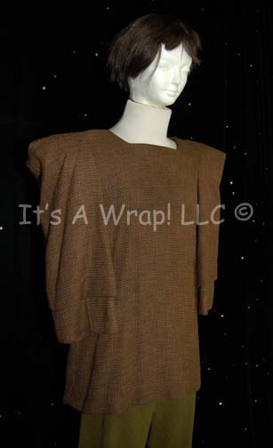 Description: A costume featured in the second part of the Star Trek: The Next Generation two-part story arc “Unification”. This costume consists of a long-sleeved, brown and black tunic in the squared-off, block style, olive-colored trousers, pumpkin-colored, knee –high socks and a Romulan-style black wig. A sewn in Voyager tag reads ‘Eric Cadora’ and a costumer’s tag reads ‘207 Unification Part II, Romulan Civilian’.