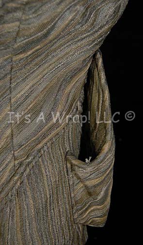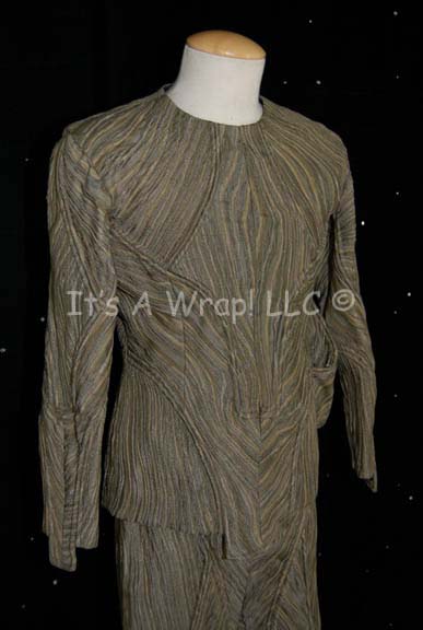 Description: A costume featured in the Star Trek: Enterprise episode “Two Days and Two Nights”; wherein several members of the “Enterprise NX-01” have varying degrees of relaxation on their shore leave to the pleasure planet of Risa. “Malcolm Reed” (Dominic Keating) and “Trip Tucker” (Connor Trinneer) are robbed while on their “vacation” by two Risan women who turn out to be alien males, this costume is that of one of the robbers after they reveal their true forms; a long-sleeved jacket featuring textured stripes in various earth tone shades from olive-green t a blue-gray. Raised piping gives a ‘ribbed’ appearance and includes matching overall-style trousers. A sewn in Enterprise tag in both items reads ‘Geoff Mead’ and a costumer’s tag reads ‘Enterprise #25, Two Days and Two Nights, male Dee’Ahn, Geoff Mead’.