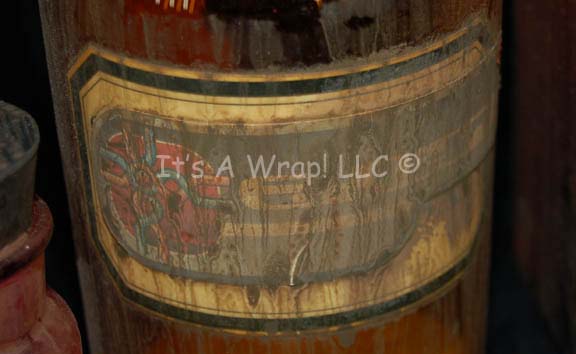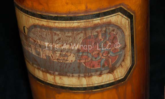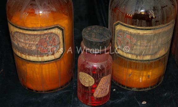Description: A lot of glass jars similar to those featured in episodes of Star Trek: Enterprise like “Civilization” and “Rajiin”. This lot consists of four jars in varying sizes and shapes; two circular jars featuring multiple labels with alien iconographic symbols, glass stoppers, and a white powder inside. A small jar itself with different iconography on the label, a rubber stopper, and filled with red fluid. The largest jar is more squarish in shape, has a label with Triskelion iconography, a cork and similar white powder. All bottles are intentionally distressed to look ‘dirty’ or ‘aged’ and all bottles except the small one with the red fluid, which is clear glass, are a dark orange glass. The Triskelion species was featured in the Original Series episode “The Gamesters of Triskelion”. The two identical jars have a height of approx. 8 inches, and a diameter of approx. four inches, the smaller bottle approx. 5 X 2, and the largest approx. 5 X 4 X 11 inches.