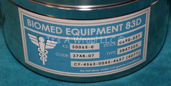 Description: A set of three metal containers appearing variously in episodes of Star Trek: Enterprise on the set of the “Enterprise NX-01” sickbay. Two of the items are stainless steel with clear plastic lids that feature flip latches and graphical applications, the third is a decontamination gel vat with a matching metal lid. One of the applications indicates its contents (item is empty) to be ‘Biomed Equipment 83D’ and the other is listed with a Denobulan themed graphic. The decon container features a piece of adhesive foam on the base for a quiet placement and retains glitter mixed gel within the vessel. The items measure approx. 3.75 X 5 inches diameter, 7.25 X 4 inches diameter, and 2 X 4.5 inches diameter. The decon gel container is believed to be one of the set that appeared in the episode “A Night In Sickbay”, the material inside is believed to be non-toxic but should in no way be treated as a medical application.