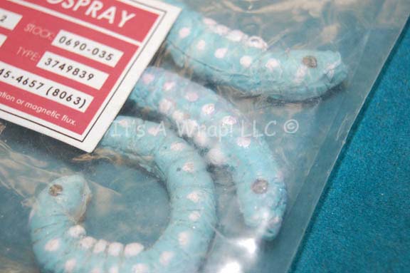 Description: A strange lot of items created for episodes of Star Trek: Enterprise. The lot contains a trio of blue colored molded rubber worm-like critters with white painted dots and legs which were located in a plastic zip bag that is adorned externally with a Starfleet inventory application listing the contents as a ‘Thoracic Hypospray’. The worms measure approx. 3 X 0.25 inches and the bag measures approx. 8.25 X 5 inches.