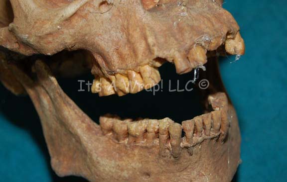 Description: A lot of four prop skulls acquired for Star Trek episodic television. The items are molded resin with hollow ‘brain cases’, and very realistic. Two of the skulls appear to be humanoid but one is noticeably larger than the other. One skull is clearly meant to be a Klingon skull and the other is an unknown alien or animal. The items are distressed to appear aged and ‘dirty’, and some feature ‘cobwebs’. The largest skull measures approx. 11 X 7 X 5 inches.