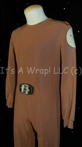 Description: A costume featured in the first Star Trek feature film. This costume is brown Class-D Starfleet uniform jumpsuit featuring an affixed plastic bio-monitor, orange science division strips attached to the shoulders, a zip up the back and a and a ‘Earthbase’ patch on the left shoulder depicting the solar system of Earth with planetary positions in black lines for the inner worlds orbits while the outer worlds are indicated in gray. The costume is intended for male wearers and features an original, sewn in Western Costuming tag that reads ‘Kaith Shiozaki’ and a second that reads ’40 Men’.