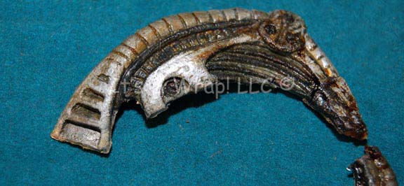 Description: A piece of special effects make-up used in the creation of the character “Seven of Nine” as portrayed by Jeri Ryan in episodes of Star Trek: Voyager. The item is metallic silver and black painted molded foam rubber located in a used condition. The piece has separated in one place and is in two pieces. The item is in excellent condition otherwise.