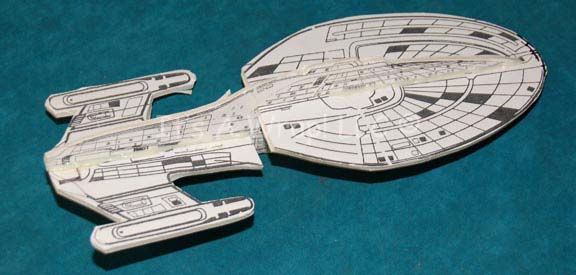 Description: A white foam core fashioned camera test model miniature of an Intrepid-Class ship like “USS Voyager” like those appearing in various episodes of Star Trek: Voyager. The item is composed of glued together sections of fashioned white foam core with graphical details adhered on the dorsal side for detail. The item measures approx. 14 X 5.75 X 3 inches.