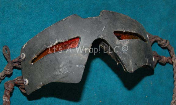 Description: A prop set of goggles created for prisoners in the Klingon dilithium mine of Rura Penthe in Star Trek VI: The Undiscovered Country. The item is made from orange lenses with multiple layers of plastic fashioned to allow eye slits and foam padding on the reverse. The item features a series of braided cord to tie around the wearer’s head. Measures approx. 6 X 2 X 3 inches. These goggles are believed to be the ones worn by DeForest Kelly in his portrayal of “Dr. McCoy”.