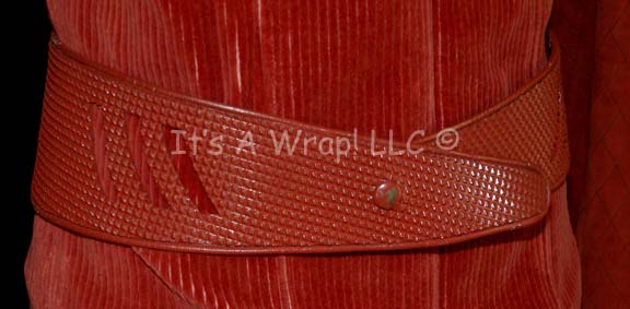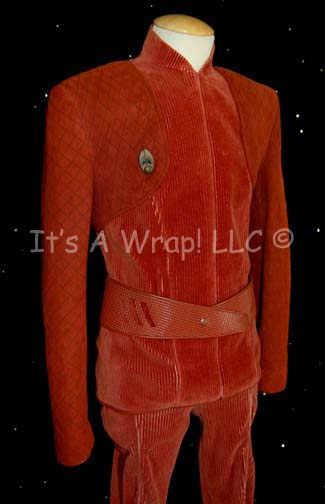 Description: A costume featured in various episodes of Star Trek: Deep Space Nine. This costume is a Bajoran Militia uniform consisting of a long-sleeved, rust-colored jacket featuring a textured, vertical, striped pattern, darker colored sleeves with a black-stitched diamond design, a Velcro patch for a commbadge (included but not attached), a metal earring that attaches via a clasp, overall-style trousers that match the striped pattern of the jacket, a red, plastic belt with a textured diamond pattern, and corresponding red leather boots featuring rubber accents of the same diamond motif . A sewn in Deep Space Nine tag in both items reads ‘Elliott Durant’; a second tag in the jacket denotes it as size 40, a tag in trousers makes it size ‘38’, and a costumer’s tag reads ‘Elliott Durant, Bajoran, 008’.