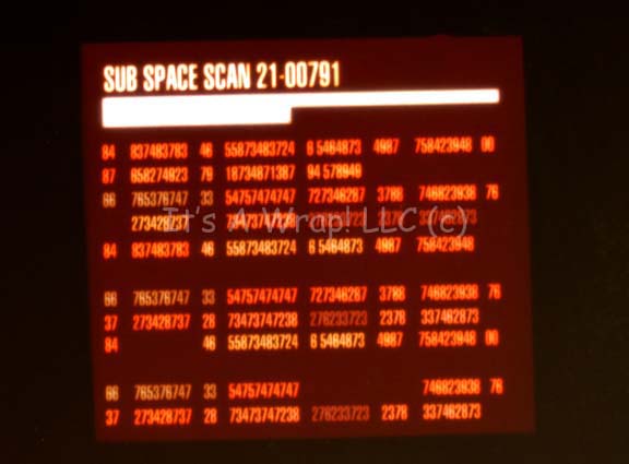 Description: A large LCARS style panel (Library Computer Access and Retrieval System) panel appearing in many episodes of Star Trek: Voyager involving the Astrometrics Lab set. The item is a large sheet of smoked acrylic with a graphical application adhered to the reverse best viewed when backlit by an external light source. The face of the item features metallic silver adhesive detail and a coating used to reduce glare and reflection of production lights. The item depicts nebula material in beautiful multi-colored renderings and an upper right hand corner section inscribed ‘Sub Space Scan’ with numeric values. The outer edge features multiple screw holes for wall mounting. In excellent condition, the item measures approx. 42.75 X 34 inches. Look for this item in the first appearance of the Astrometrics Lab set “Year of Hell, Part I”.