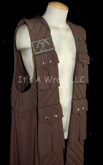 Description: A costume element featured in such Star Trek: The Next Generation and Deep Space Nine episodes like “The Emissary” and “You are Cordially Invited”. This item is a Klingon Warrior’s robe sometimes worn over the uniform and consists of a sleeveless, full-length robe featuring quilted gray-brown fabric, multiple buttoned pockets down the front and a large central pocket in the back; a hood-like accent off the shoulders in the back and twin, metal, Klingon badges with iconographic symbol in the front. A sewn in Deep Space Nine tag reads ‘Michael Dorn’.