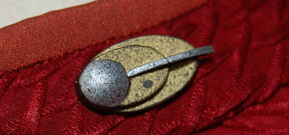Description: A costume featured during the last season of Star Trek: Deep Space Nine for wear by Nana Visitor in the role of “Colonel Kira Nerys”. This costume consists of a long-sleeved, full-length rust-colored jumpsuit featuring a deep red, textured, “X” pattern across the chest, back and down the sleeves, slightly lighter colored, raised piping down the front, stirrups for the feet, a Velcro patch for a commbadge (included and attached); a matching, corduroy holster and corresponding, chunk-heel, leather ankle boots with textured, rubber accents. The costume includes “Major” rank placement that was found separately. A sewn in tag reads ‘Deep Space Nine, Nana Visitor #2’ and the costumer’s tag reads ‘DS9 Seventh 7, Kira, Nana Visitor’.