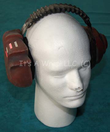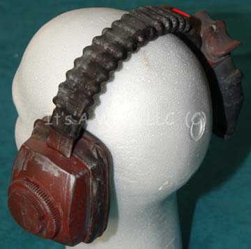 Description: A lot of items featured in the sixth Star Trek feature film “The Undiscovered Country”. This lot consists of a distressed, rust-colored metal canteen featuring Klingon iconographic symbols, a nylon strap with a metal buckle closure, a fabric arm-strap, and a black tube coming out of the canteen. A pair of rust-brown, sturdy plastic manacles that feature metal chain and hinges made for huge arms, and a pair of matching, distressed, headphones with blinking red lights activated by a switch on the inside of the left ear that is powered by a 9-volt battery. The canteen measures approx. 8 X 4.5 X 3.5 inches, the headphones are 7.5 X 7 X 5 inches and the manacles themselves have a diameter of approx. 6.5 inches and the chain is approx. 33 inches uncoiled.