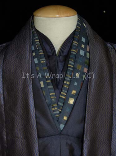 Description: A costume featured in opening scenes of the tenth Star Trek feature film “Nemesis”. This costume consists of a metallic-blue long-sleeved, full-length under robe with a slit up the legs, quilted, zip cuff adjustment and features multiple false interior collars in the same multi-colored square style as the Romulan fleet uniforms all on top of a matching dickie with a Mandarin collar. The outer robe is made of a metallic, lighter blue and pewter-colored zigzag pattern featuring elbow length, large bell-sleeves, and an open front. A pinned in tag on each robe reads ‘#15, William Bebow’