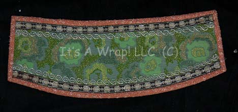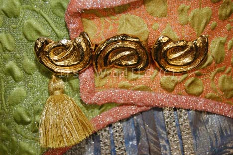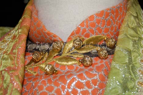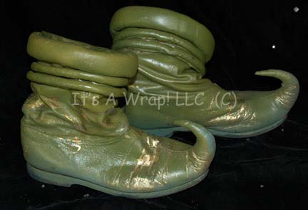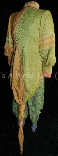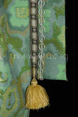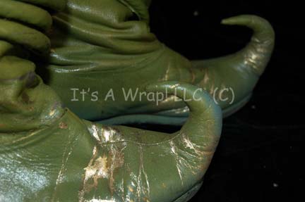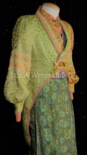 Description: An unidentified Ferengi character in the Star Trek: The Next Generation episode “The Price”, “Kol” became a central figure in the Star Trek: Voyager episode “False Profits”; wherein he and his cohort “Arridor” (Dan Shor) got stuck in the Delta Quadrant and made their way to a primitive planet where they could style themselves as deities of the local mythology. This costume starts with a sleeveless jumpsuit that zips up the front and has stirrups at the feet. The rich fabric is multiple shades of green entwined with silver thread to make it sparkle. Along the side of each leg are wing like strips of fabric with ornate ribbon and silver robe trim. At the bottom of each is a gold thread tassel. The next layer is a long sleeved orange cropped top with interwoven silver thread. There is ribbon neckline trim and a gold leaf design at the front of the collar. Seven gold monkey fist knots are attached to the leaf for decoration. The top zips up the back and has clasps at the wrists. Over the orange top is a blue, purple and silver waistcoat with a floral motif and square neckline. It also has two strips of flat sparkling chain metal running down each side of the Velcro opening at the front. The final layer is a tailed and lined overcoat complete with shoulder pads and made of two complimentary fabrics that both have the same raised leaf design but in two different color schemes. On the right, the fabric is different shades of green with orange accents and on the left the fabric is primarily orange with green accents. The two fabrics cross over in the back and are separated by an orange sparkling trim. The beautiful lapels and bands around the arms incorporate beads and gold twine in a chevron pattern. There are three metal gold colored costume jewelry accents that clasp the front of the coat together with a gold tassel to the right. The coat tail comes together with three knots down its length that culminate with two gold tassels. The costume is complete with green and gold boots that curve at the toe into pixie points and the essential Ferengi head wrap that complements the rest of the outfit. Each item features a sewn in Voyager tag that reads ‘Leslie Jordan’ and the costumer’s tag reads ‘Voyager #144, Kol, Leslie Joyce’.