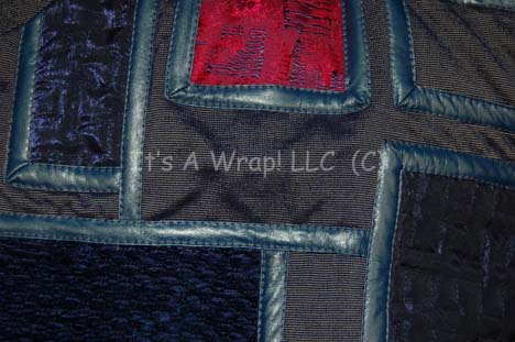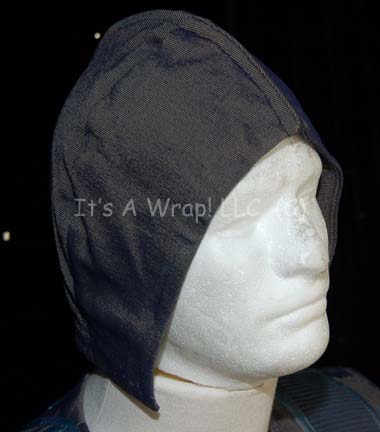 Description: A costume featured in the Star Trek: Voyager episode “The Raven”; wherein "Seven of Nine" (Jeri Ryan) begins to hallucinate as her Borg components reassert themselves and she fears she is being called back to the Collective. This costume consists of a long-sleeved, iridescent blue jumpsuit with a zip up the back, a cropped, iridescent-blue jacket featuring turquoise trim, blue and red geometric shapes, Velcro at the front, and a wide, suede, blue cummerbund with dark-blue leather stripes. A sewn in Voyager tag on both items reads ‘Richard Zobel’, a costumer’s tag reads ‘174 The Raven, Gauman, Richard Zobel’ and a costumer’s tag denotes the item for later wear by ‘Vincent Muller’.