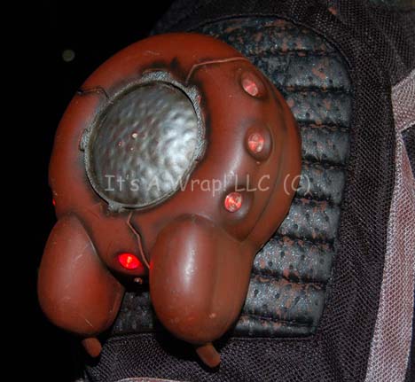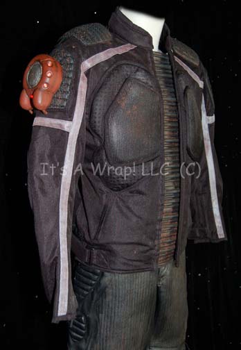 Description: A costume featured in the Star Trek: Enterprise episode “Anomaly”; wherein the “Enterprise NX-01” is attacked by pirates called “Osaarians”. This costume consists mostly of components garnered from motorcycle wear; a long-sleeved, black jacket featuring multiple sites of reinforced padding, black, textured rubber accents, matching trousers with painted on distress to appear aged, and a cast resin ‘transporter’ device affixed to the right sleeve by Velcro that lights up in two places when activated by either of its two switches. The costume features name brand labels by ‘First Gear’ and sewn in Enterprise tags on both items that denote wear for Mike Watson.