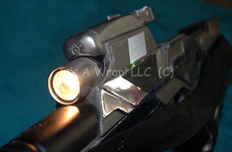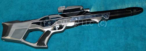 Description: A prop Starfleet Type III Mark III phaser rifle created for use in Star Trek X: Nemesis. The item is high quality cast resin painted metallic silver with multiple chrome colored silver adhesive applications, an affixed static mounted black nylon strap, and features a working flashlight in the ‘scope’. The flashlight twists to activate and the batteries retain power from production use. The ‘scope’ is broken away but the originally molded mount is still present. The item features a static trigger and a pair of oval shaped faux buttons molded onto the stock. The item measures approx. 33 X 9 X 2 and excepting damage to the ‘scope’ the item is in excellent overall condition; minimal rubbing or wear is depicted, the top of the barrel is slightly scraped but really quite nice.