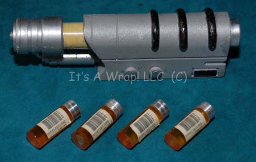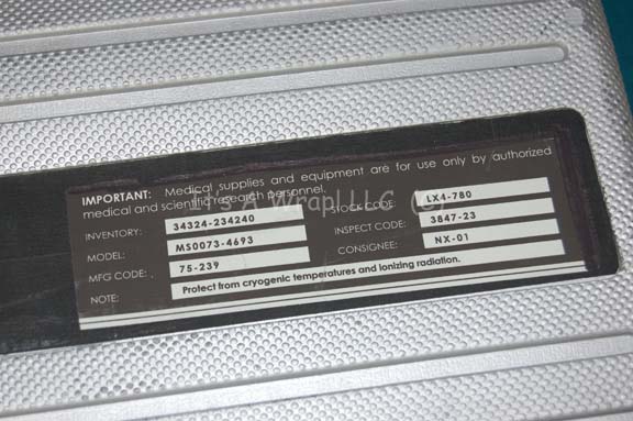 Description: A pair of plastic carry cases appearing in Star Trek: Enterprise episodes like “E2” in the case of the dark gray item. The dark gray item is distressed to appear aged and opens to reveal a series of empty holding points for unaccompanying props; the exterior is fitted with metal shoulder strap rings. It appeared in the hands of the second “Enterprise NX-01” crew when they stole the anti-matter injectors. The second item is painted metallic silver with a Starfleet inventory application informing the user to avoid ‘cryogenic temperatures and ionizing radiation’. The interior is fitted with an untested electronic stethoscope that is labeled to be powered by three AAA sized 1.5volt batteries. The stethoscope is comprised of three pieces, a hearing apparatus, a connector cable with stereo mini-jack ends, and a digital microphone. The item also contains four silver colored metal topped acrylic cylinders meant to appear as vials, each one is labeled with adhesive paper by a barcode and reads ‘Emory Erikson’ who was portrayed in the episode “Daedalus” by Bill Cobb as the father of the transporter. The items are intended to be medicine for the paralyzing effects of a transporter accident. A cast resin Enterprise-style hypo is also present in the lot which was not located with the case and which fits into the slot prepared for a differing one. It is painted metallic silver with other painted accents. The cases both measure approx. 15 X 10 X 3.25 inches.