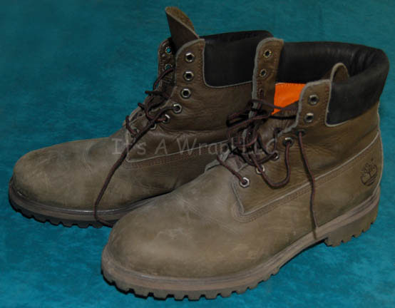 Description: A costume featured in the ninth Star Trek feature film, “Insurrection”; wherein the crew of the “Enterprise-E” rebels against Starfleet and the Federation to prevent the exploitation of a defenseless race called the Baku. This costume consists of two sleeveless, metallic-colored, shirt of a spandex-like material, a long-sleeved, tan tunic featuring a slightly raised diamond pattern, a black nylon belt, and a gray, silk-like lining; a bandolier/vest in an “X” shape of an olive green fabric with a slightly darker green trim, and brown/gray, suede, “Timberland” brand hiking boots with black accents, and heavy-duty rubber soles. A handwritten costumer’s tag reads ‘Stunt Worf’.