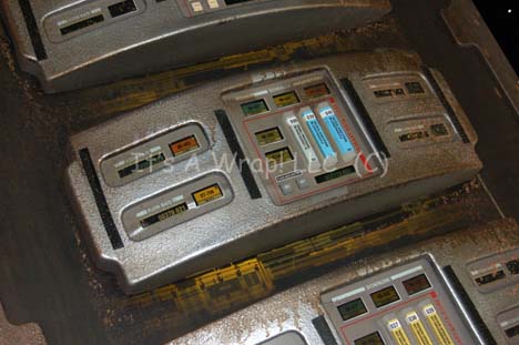 Description: A set piece featured in various episodes of Star Trek: Enterprise and appearing in the Star Trek: Voyager episodes “Workforce Parts I and II”. The item is an acrylic panel with a wood trim edge around it that has a vacuum formed trio of raised interfaces mounted on its front. The item has been altered for use on Enterprise and as such, the acrylic panels inset to the item are made in the style of Enterprise, visible when backlit. The item also features static, adhered data modules. The item measures approx. 34 X 37 X 3 inches and was distressed for use in the episode “Damage” where it appeared as part of the Iryllian starship.