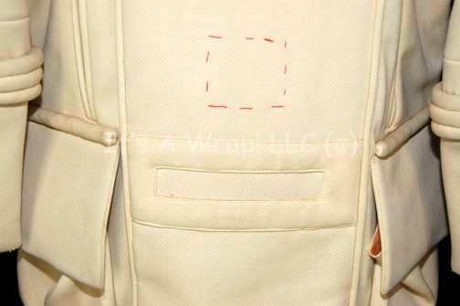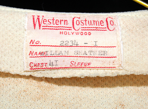 Description: An unfinished Starfleet away team field jacket like those featured in Star Trek II: The Wrath of Khan for wear by William Shatner in his portrayal of “Admiral Kirk”. The item is made from off white colored un-dyed fabric with multiple sewn in raised accents for a busier appearance. The item features a high degree of deteriorated foam interior lining that has collected in the folded up hems that are not sewn shut. The pockets also have collected a degree of this same material, it has not detracted from the overall external appearance of the item. The asymmetrical front seals through the use of Velcro placements; the costume features two front and reverse flap pockets and a pair of hand pockets. A sewn in Western Costume Co. tag reads ‘William Shatner’.