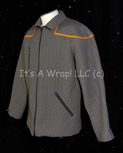Description: A costume item used as a template or prototype for the “away team jacket” featured in various episodes of Star Trek: Enterprise. This item is a long-sleeved jacket featuring a quilted, hexagonal design, Command Gold trim around the shoulders, three zip pockets and a zip down the front. The item comes with a costumer’s tag that reads ‘Enterprise, prototype away jkt’.
