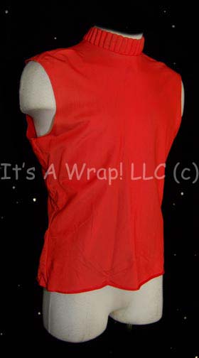 Description: A costume item featured in various Star Trek feature films from “The Wrath of Kahn” to the opening scenes of “Generations. This item is a sleeveless, Starfleet uniform undershirt in Cadet/Trainee Red with a ribbed collar, clasps at the neck, and zip down the back. The item is a size 40 and made for men.