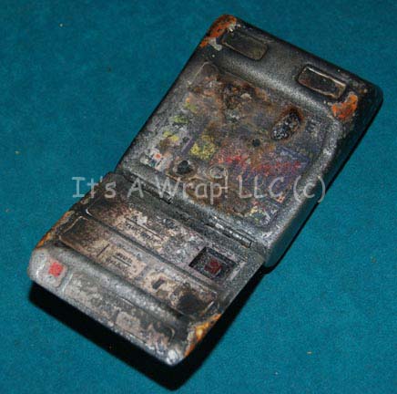 Description: A prop item featured in various episodes of Star Trek: Voyager. The Tricorders were made for Starfleet as a multi-purpose scientific and technical device; all of which were fitted with cutting edge sensing equipment. This tricorder is resin cast in gray with a flip-open design with all of the controls, “screen” and faux buttons intentionally distressed to appear “charred”. The item measures approx. 6 X 3 X 1 inches deployed.