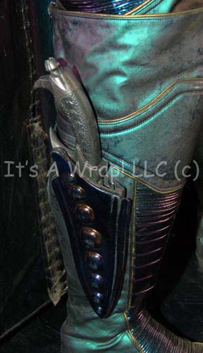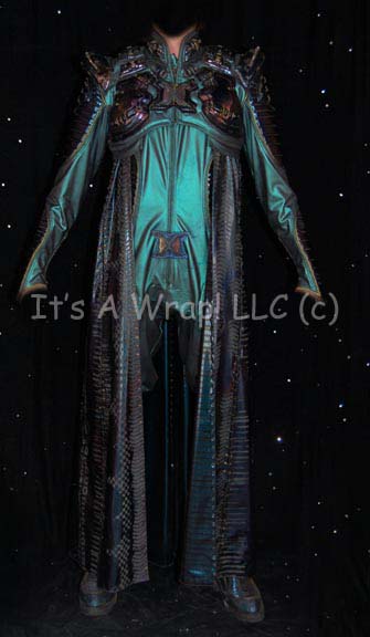 Description: An incredible stunt costume in excellent condition featured in Star Trek X: Nemesis for wear by Todd Bryan while performing stunts as the “Reman Viceroy”. The costume is made from shiny iridescent purple material with multiple molded accents and sewn in metal embellishments. It is composed of these separates: A black undershirt to prevent chafing, a set of overalls, a full length cape, a uniform jacket with shoulder armor, and a pair of knee high boots. The boots feature zips up the back of the leg, thick soles, and a sheath on the right outer leg for an accompanying prop knife. The knife is molded rubber with a blade separation, a spiked pommel and finger guards; the ‘blade’ points on the ends are broken off revealing the metal interior framework, the item is painted olive green with a black handle. The overalls are purple with multiple padded points and matching material over the shoulders and around the arms, Velcro placements correspond to the cape. The cape is inscribed internally ‘Ron #1’ for Ron Perlman who portrayed the “Reman Viceroy” in the film, it is nine lengths of iridescent purple material with painted on patterns, all formed together with metal work, with holed openings for the arms made from olive colored fabric. The uniform jacket matches the overalls, is inscribed internally ‘Todd’ and ‘Ron stunt’, is long sleeved with inside wrist zips, gold colored piping, molded ‘armor’ pieces affixed to the chest, back, and shoulders, and cropped to the upper chest with a center zip that is hidden by a molded ‘X’ embellishment. The costume also comes with a molded Reman ‘X’ ‘buckle’ accent to affix to the Velcro placement waist high on the overalls. The overalls legs fit neatly into the boots when they are zipped up, the calves of the legs and the hem are unfinished. A portion of the chest on the overalls right breast features a sewn in patch with a hole in it possibly for a special effects squib burst.