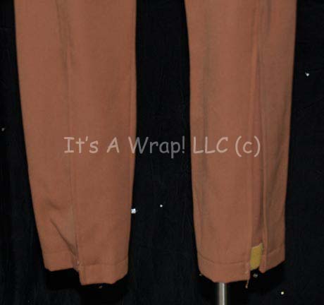 Description: Trousers similar to those featured in the first Star Trek feature film. Brown, Starfleet uniform trousers featuring an adjustable waistband, Velcro cuff adjustment and loose threading at the waist. The trousers are made for wear by women and are size 10.