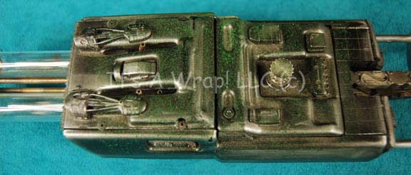 Description: A prop item featured in the Star Trek: Voyager episode “Juggernaut”; wherein Voyager finds a critically damaged Malon freighter that, if it explodes, will infect and entire sector with deadly radiation. This item, the subdermal injector, is the Malon equivalent of a hypospray and consists of a dark-gray, heavy molded-plastic frame with textured accents meant to denote circuitry or function, a silver-colored screw on the top, two “sample vials” sticking out the back that disappear partly into the body of the item, a metal-colored front support with two matching tines that spring back out into position when pushed into the device. The item measures approx. 12.5 X 3 X 2 inches.