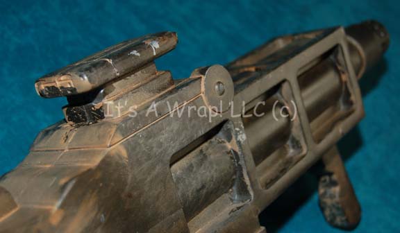 Description: A prop weapon featured in the Star Trek: Enterprise episode “Extinction”; wherein “Captain Archer” (Scott Bakula), “Lt. Reed” (Dominic Keating), and “Ensign Hoshi Sato” (Linda Park) are infected with an alien pathogen that causes them to de-evolve to a primal state. The item is a prop “flame thrower”, rubber cast in brown and complete with a faux scope and various “screws” and accents that would be on a working counterpart. The item measures approx. 26 x 11 x 3 inches.