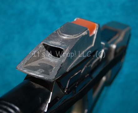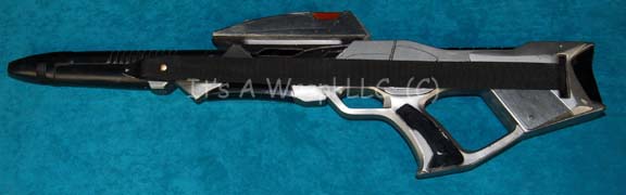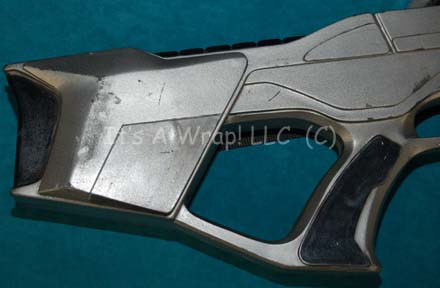 Description: A Starfleet Type III Mark III Phaser rifle of the style first seen in Star Trek “First Contact”. This item is composed of sturdy, molded rubber with cast resin components and a static, nylon shoulder strap with a metal clasp on the barrel (a feature missing on many models of this type) . Black with metallic silver paint, orange-colored acrylic accent on the ‘scope’ in addition to a “crosshair” accent on the end. The prop is significantly lighter than its resin counterparts while still retaining an amazing likeness to hero versions. There are slight instances of scuffing and rubbing and uneven surfaces along raised textures but despite these things, this item is particularly sturdy for molded rubber. Measures approx. 32.75 X 9.25 X 2 inches.