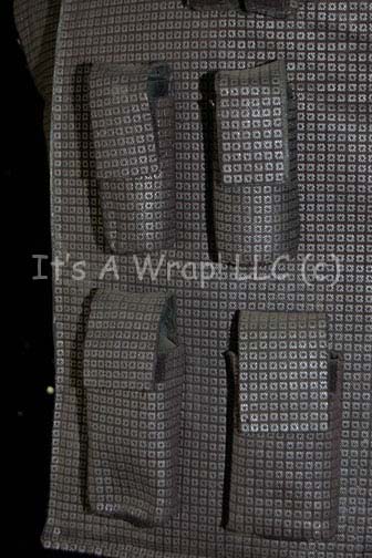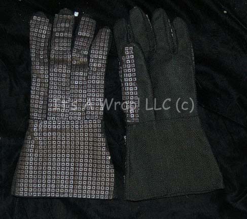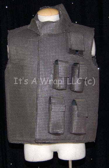 Description: A costume featured in the premiere episode of Star Trek: The Next Generation, “Encounter at Farpoint”; wherein the crew of the “Enterprise-D” is challenged by “Q” (John DeLancie) to solve the mystery of Farpoint Station. This costume consists of a heavy, reinforced, black vest featuring a silver-colored “chainmail” pattern, and several pockets on left side with Velcro closures that are made to look as if they are being used. Also included are arm, leg, and lower torso armor of the same design, matching gloves and a padded helmet that covers all but the front of the face. All items have minor wear due to time and storage, a costume tag that reads ‘John Johnson’, and a tag attached to the gloves reads ‘21st Century solider #1, Marty Valinsky’.