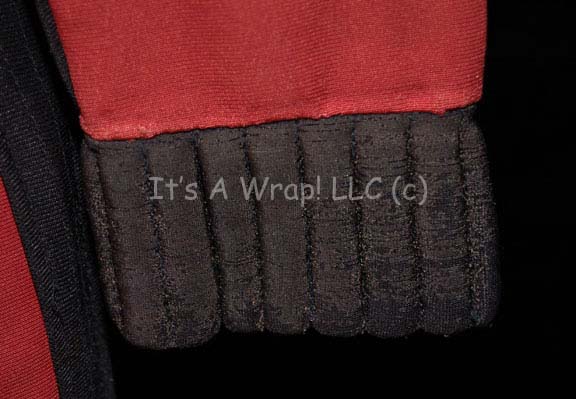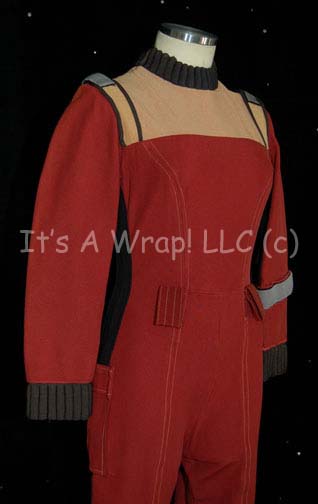 Description: A costume similar to those featured between the second Star Trek feature film, “The Wrath of Kahn”, and the opening scenes of the seventh, “Generations”. This costume is a long-sleeved, burgundy jumpsuit featuring tan shoulders, black piping, Operations Gray shoulder division strips with matching strips around the left wrist cuff, black ribbing around the collar and cuff, belt loops around the waist, and a black stripe that follows the length of the arm, down the ribs and ends at the ankle cuff. Included is a resin-cast, pin-backed Starfleet emblem, a pin-back badge denoting the non-commissioned rank of “Senior Chief Petty Officer”, and two round, textured, commendation pins. There are clasps, Velcro, snaps, and a zip down the back.