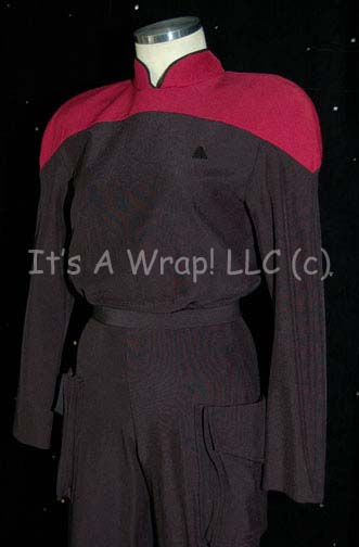 Description: A costume similar to those featured in Star Trek: The Next Generation episodes like “The First Duty” and the Voyager episode “In the Flesh”. This costume is a Starfleet cadet uniform consisting of a long-sleeved, full-length, black jumpsuit featuring red shoulders, black piping around the Mandarin collar, a Velcro patch for a commbadge (sold separately), a matching black belt, deep, open-topped pockets on each trouser leg, a zip down the back, and stirrups for the feet. A sewn in Voyager tag, most likely making it from the episode “In the Flesh”, reads ‘Angela Valverde’.