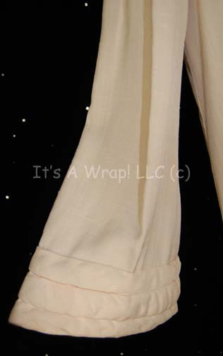 Description: A white colored Vulcan robe like those appearing in Star Trek III: The Search for Spock. The item is full length with a zip up the spine. The sleeves are kimono style with rings sewn into the cuffs. Robes like these can be paired up to sashes for women, and drapes for men.