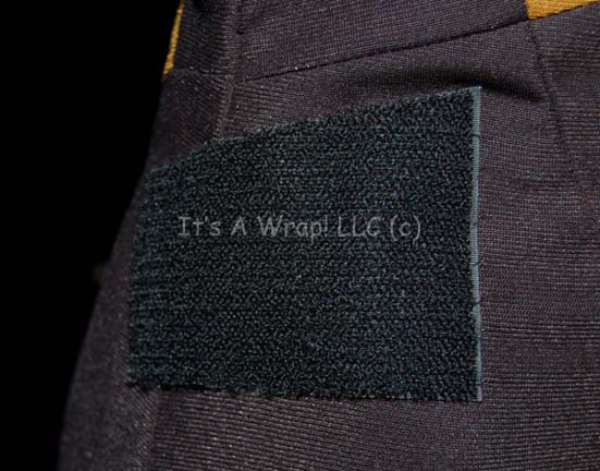 Description: This Starfleet uniform jumpsuit consists of black shoulders with an Operations Gold chest, back, sleeves, and piping around the Mandarin collar; a black waist and legs that end in stirrups. This particular uniform has zips that close the front of the costume and features a Velcro patch on the left breast for a commbadge (sold separately) and a second one on the right thigh for ‘away team gear’. There is a hole between the legs of the garment just big enough to get a finger through but can be easily repaired. A sewn in tag sets the size at ‘34’ and the number at ‘208’.