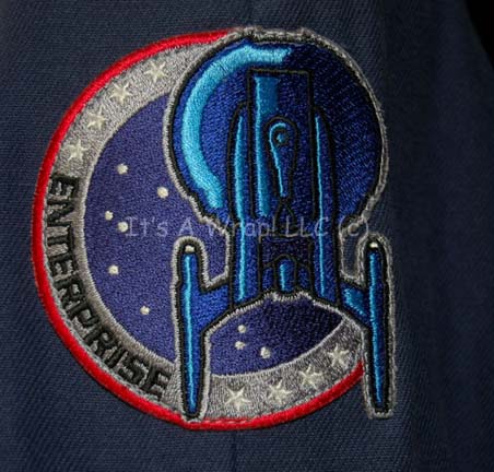 Description: A Starfleet uniform jumpsuit including the famous ‘Enterprise NX-01’ left shoulder patch with Operations Red division trim around the shoulders. “Enterprise” costumes feature multiple zippered pockets, Velcro size adjustments and zippers at the wrists and ankles, and a black, sleeveless, button up undershirt. A sewn in Enterprise tag in both garments indicates wear by ‘Jeffrey Penn’.