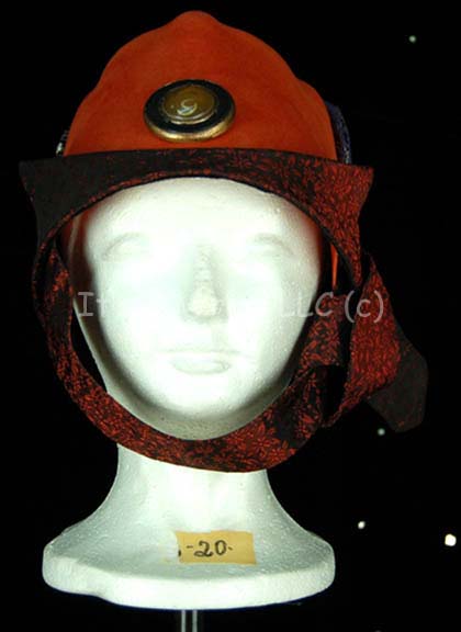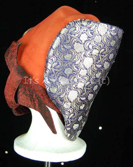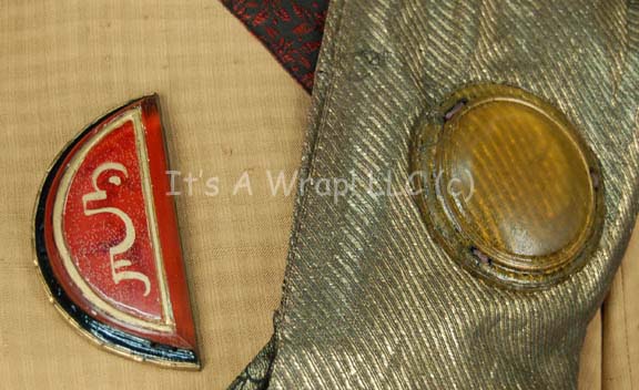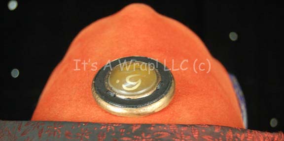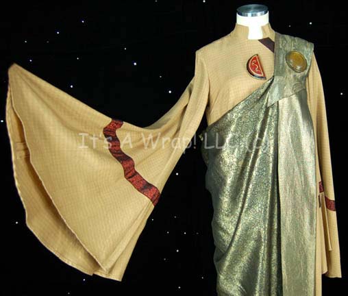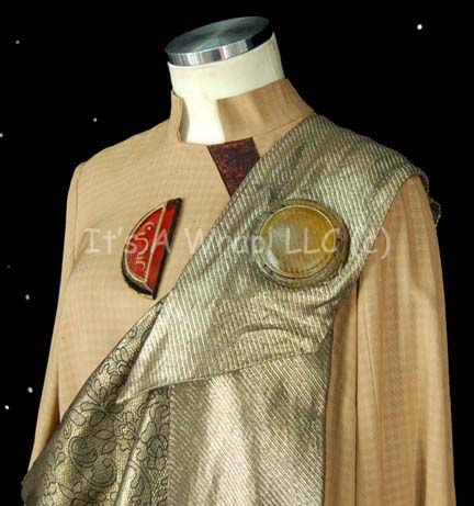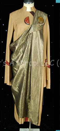 Description: A costume similar to those featured near the end of “The Search for Spock”, the beginning of “The Voyage Home”, and various instances in other episodes and films. This costume consists of a full-length, light-brown gown featuring vertical stripes in dark, iridescent red floral pattern down the front and along the cuffs; large, bell sleeves, and a semi-circular, red “jewel” with gold Vulcan iconographic symbols. A metallic-gold sash featuring a black-outlined, floral pattern, a large stripe down the left side with diagonal stripes itself, and a similar, circular, yellow “jewel” minus the Vulcan iconography. Included is a Vulcan-style, rust-colored, felt hat featuring the same dark-red, iridescent fabric, a blue, and metallic-silver leaf-patterned accent on the back and an additional “jewel” with Vulcan iconography. A sewn in tag on the costume reads ‘3-9’ and a tag in the hat reads ‘4-20’.