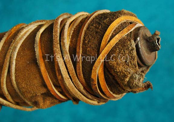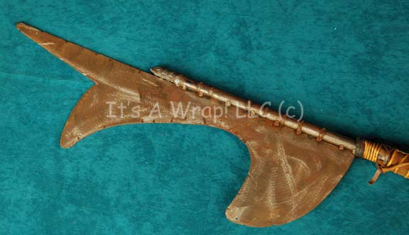 Description: A prop weapon similar to those featured in the Star Trek: Voyager episode "Hunters"; wherein the Voyager crew comes upon the relay station they used to send messages back to the Alpha Quadrant. This item consists of a metal staff wrapped in leather strap and then tied tight with more leather cord, and a large multi-pronged blade like a large quasi-halberd. The items measure 45 X 16.5 inches.