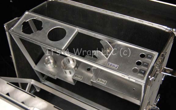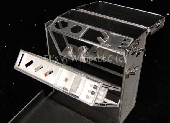 Description: A medium sized prop tool box featured in the Star Trek: Enterprise episode “Minefield” for use by “Malcolm Reed” (Dominc Keating) and “Captain Archer” (Scott Bakula). The item is a heavy duty plastic case with a hinged top lid and a hinged side wall. The item is metallic silver colored all the way round externally with a pair of “Enterprise NX-01” assignment applications adhered to the front and reverse. Actual metal corner covers reinforce the edges. The lid opens by way of butterfly clips and the wall opens by way of flip latches to reveal two internally positioned hinged tool brackets. The brackets are silver colored polished metal with holes for tools that are not present. They are adorned with rubber faux buttons and inventory applications. The entire interior is lined with black rubber coating to protect the contents. Closed, the item measures approx. 15.5 X 19 X 10 inches. The top features an industrial strength metal handle with rubberized grip. Externally, the item was inscribed with packing information during set strike reading ‘P-5’.