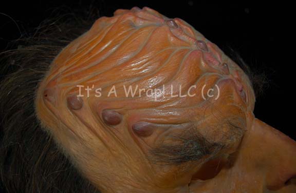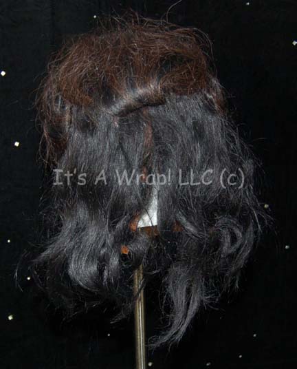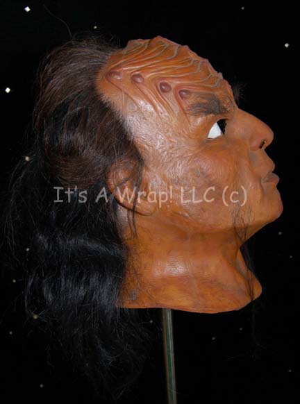 Description: A Klingon head latex appliance featured in the courtroom scene of Star Trek: The Undiscovered Country. Instead of putting all two hundred extras in full prosthetics, these full head masks were created. This latex head has been completely painted and airbrushed with hair attached behind the forehead ridges and braided at the back of the head. Facial hair has been added for eyebrows and a two-part beard. Under the hair at the back of the head is a concealed Velcro strip to allow the wearer to take the mask on and off more easily. The item measures approx. 12 x 7 x 11 ½ inches.